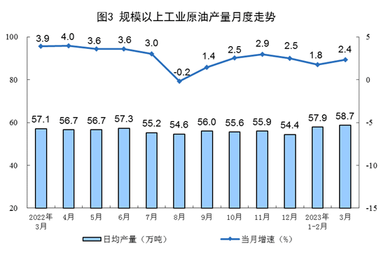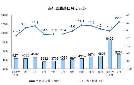 原油生產(chǎn)略有加快,進口由降轉(zhuǎn)增。3月份,生產(chǎn)原油1818萬噸,同比增長2.4%,增速比1—2月份加快0.6個百分點,日均產(chǎn)量58.7萬噸。進口原油5231萬噸,同比增長22.5%,1—2月份為下降1.3%。