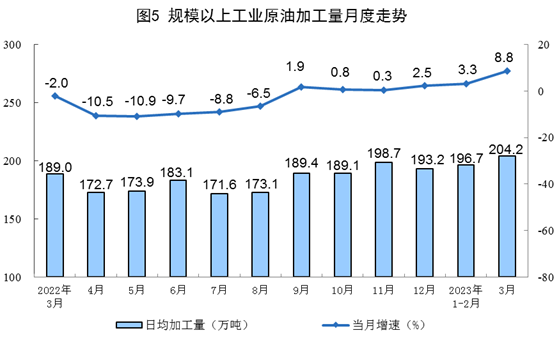 原油加工增速加快。3月份,加工原油6329萬噸,同比增長8.8%,增速比1—2月份加快5.5個百分點,日均加工原油204.2萬噸。1—3月份,加工原油17926萬噸,同比增長5.2%。