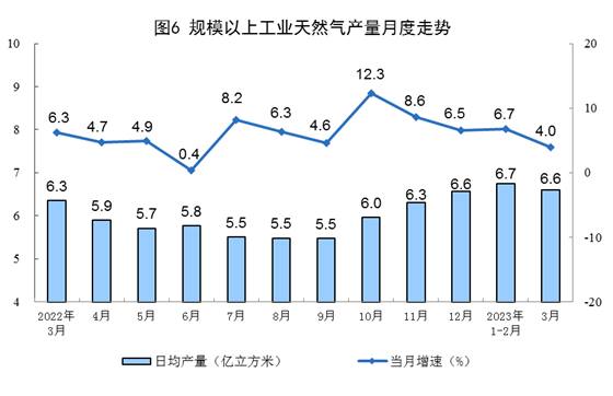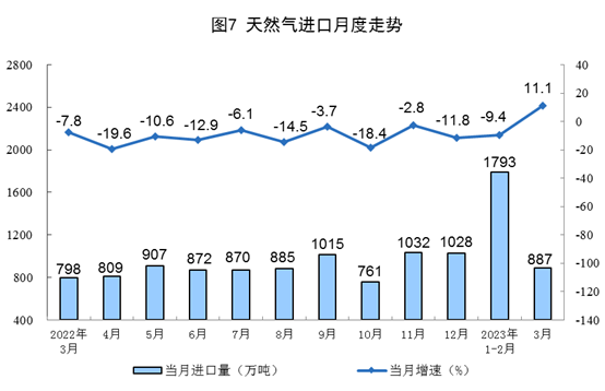 天然氣生產(chǎn)有所放緩,進口由降轉(zhuǎn)增。3月份,生產(chǎn)天然氣205億立方米,同比增長4.0%,增速比1—2月份放緩2.7個百分點,日均產(chǎn)量6.6億立方米。進口天然氣887萬噸,同比增長11.1%,1—2月份為下降9.4%。