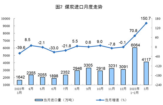 原煤生產(chǎn)穩(wěn)定增長,進口大幅增加。3月份,生產(chǎn)原煤4.2億噸,同比增長4.3%,增速比1—2月份放緩1.5個百分點,日均產(chǎn)量1346萬噸。進口煤炭4117萬噸,同比增長150.7%,增速比1—2月份加快79.9個百分點。