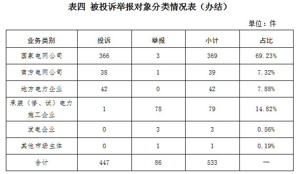 從被投訴舉報(bào)對(duì)象看,供電企業(yè)450件、占投訴舉報(bào)總數(shù)的84.43%,其中國(guó)家電網(wǎng)公司369件、占投訴舉報(bào)總數(shù)的69.23%,南方電網(wǎng)公司39件、占投訴舉報(bào)總數(shù)的7.32%,地方電力企業(yè)42件、占投訴舉報(bào)總數(shù)的7.88%;承裝(修、試)電力施工企業(yè)79件、占投訴舉報(bào)總數(shù)的14.82%;發(fā)電企業(yè)3件、占投訴舉報(bào)總數(shù)的0.56%;其他市場(chǎng)主體1件、占投訴舉報(bào)總數(shù)的0.19%。
