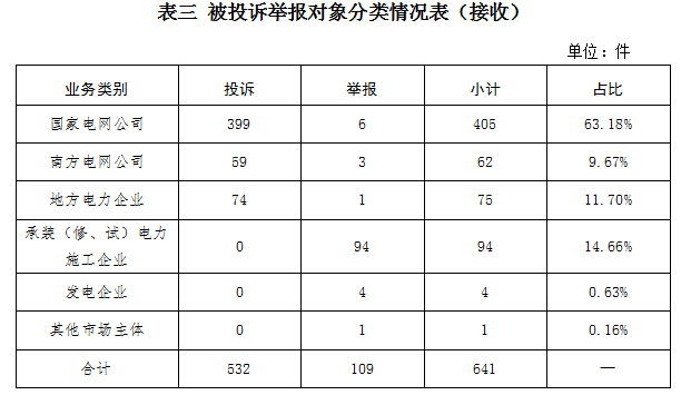 供電企業(yè)542件、占投訴舉報(bào)總數(shù)的84.55%,其中國(guó)家電網(wǎng)公司405件、占投訴舉報(bào)總數(shù)的63.18%,南方電網(wǎng)公司62件、占投訴舉報(bào)總數(shù)的9.67%,地方電力企業(yè)75件、占投訴舉報(bào)總數(shù)的11.70%;承裝(修、試)電力施工企業(yè)94件、占投訴舉報(bào)總數(shù)的14.66%;發(fā)電企業(yè)4件、占投訴舉報(bào)總數(shù)的0.63%;其他市場(chǎng)主體1件、占投訴舉報(bào)總數(shù)的0.16%。