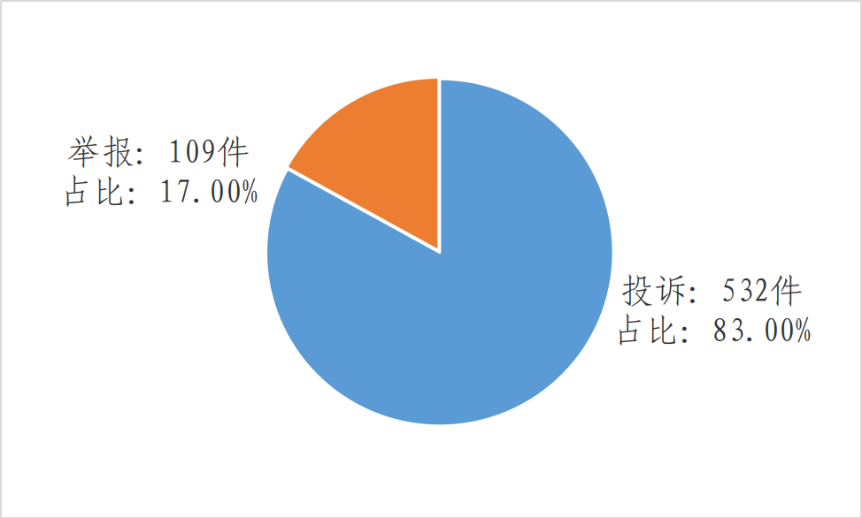 2023年4月,12398熱線共接收投訴舉報(bào)641件,環(huán)比增長(zhǎng)1.26%、同比下降13.14%。其中:投訴532件,環(huán)比下降0.75%、同比下降27.12%;舉報(bào)109件,環(huán)比增長(zhǎng)12.37%、同比增長(zhǎng)105.66%。