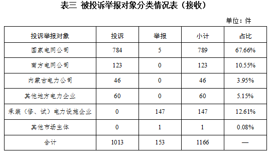 從被投訴舉報(bào)對(duì)象看,供電企業(yè)921件、占投訴舉報(bào)總數(shù)的86.07%,其中國家電網(wǎng)公司712件、占比66.66%,南方電網(wǎng)公司107件、占比10.01%,內(nèi)蒙古電力公司38件、占比3.55%,其他地方電力企業(yè)64件、占比5.85%;承裝(修、試)電力設(shè)施企業(yè)148件、占比13.84%;其他市場主體1件、占比0.09%。