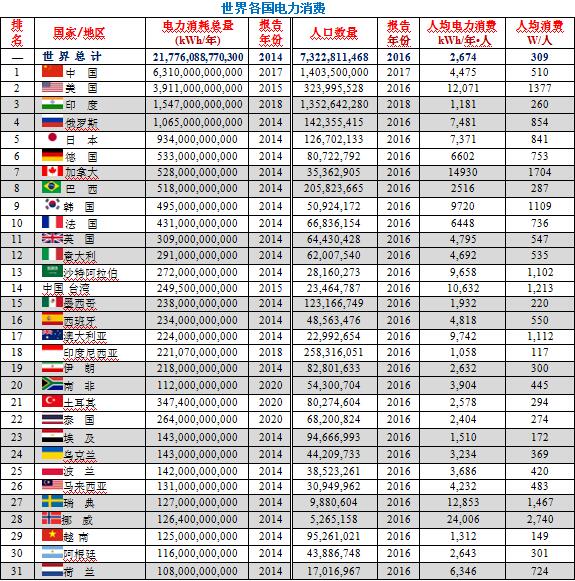 本表以電力消費總量排序,中國居第一、美國第二、印度第三。