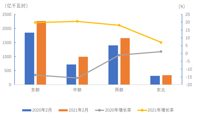 1-2月,東、中、西部和東北地區(qū)②全社會(huì)用電量分別為5657、2407、3754和770億千瓦時(shí),增速分別為27.0%、20.8%、19.2%和10.0%。