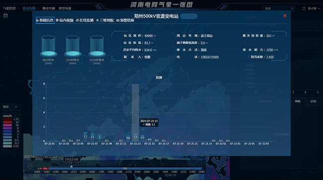 “一張圖”建設以電網氣象災害風險預報預警模型為核心,集夏季防汛、冬季覆冰舞動、春秋季風災等多種電網氣象災害風險預報預警于一體,預警信息的地理精度可具體到變電站、線路桿塔。通過平臺可實時捕捉電網設備的氣象要素監(jiān)測和預報信息,以及變電站周邊環(huán)境監(jiān)控等。當出現(xiàn)重大天氣過程時,平臺根據不同風險等級預測,動態(tài)提供“一站一策式”的24小時、72小時內應對措施建議。