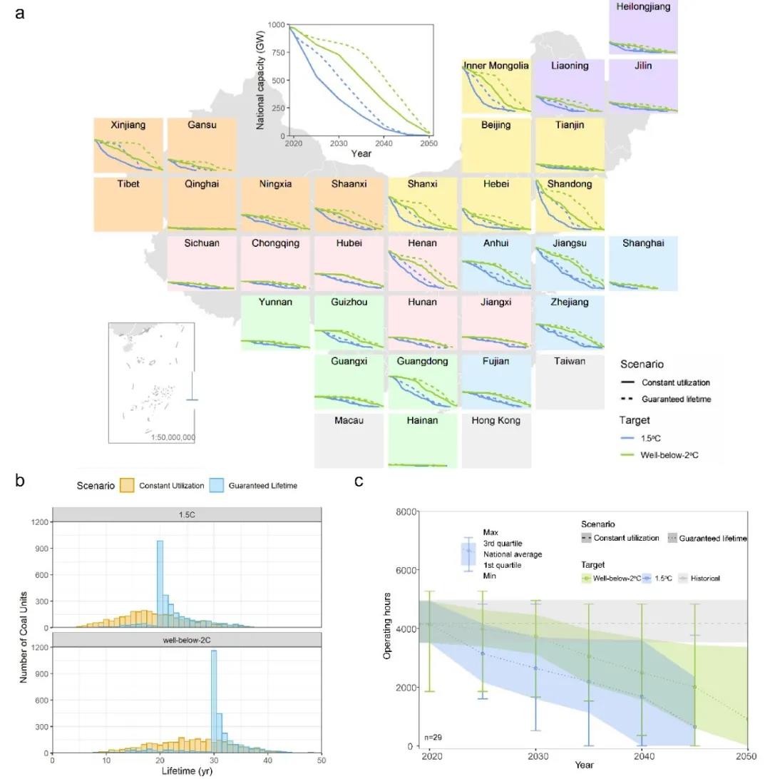 為實(shí)現(xiàn)《巴黎協(xié)定》氣候目標(biāo),未來30年中國需要在燃煤發(fā)電行業(yè)實(shí)現(xiàn)深度減排,并達(dá)到凈零排放。近期發(fā)表于《自然-通訊》上的研究對中國實(shí)現(xiàn)氣候目標(biāo)和減排途徑的可行性展開了分析,研究者們首先依據(jù)技術(shù)屬性、盈利能力、環(huán)境影響對中國1037個(gè)現(xiàn)役燃煤電廠的退役優(yōu)先級進(jìn)行逐一評估,并結(jié)合全球升溫1.5°C和2°C目標(biāo)情景,提出了可持續(xù)的中國燃煤電廠退出路徑選擇。研究發(fā)現(xiàn),為實(shí)現(xiàn)氣候目標(biāo),中國需要在短期內(nèi)停止新建燃煤電廠,優(yōu)先退役落后產(chǎn)能,可以通過降低利用小時(shí),保障大部分機(jī)組20年(1.5°C目標(biāo))或30年(2°C目標(biāo))的運(yùn)行年限,并在2045年(1.5°C目標(biāo))或2055年(2°C目標(biāo))前實(shí)現(xiàn)全面的煤電退出。