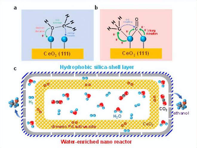 其中的水環(huán)境可以穩(wěn)定雙靶活性位點,里邊的催化劑能夠在240℃、3MPa時將二氧化碳近100%選擇性高效穩(wěn)定地轉化為乙醇。