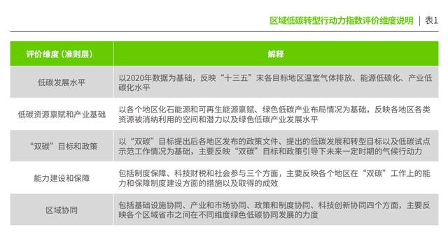 區(qū)域低碳轉(zhuǎn)型行動(dòng)力指數(shù)評(píng)價(jià)維度說明。綠色和平供圖
