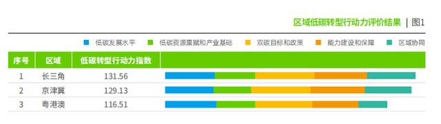 “長三角的低碳轉(zhuǎn)型行動(dòng)力指數(shù)最高;京津冀在“雙碳”目標(biāo)和政策及能力建設(shè)和保障方面表現(xiàn)最突出;粵港澳則在低碳發(fā)展水平方面最具優(yōu)勢。”