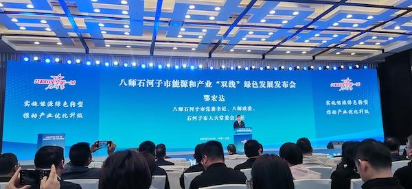 圖說(shuō):新疆生產(chǎn)建設(shè)兵團(tuán)第八師石河子市能源和產(chǎn)業(yè)“雙線”綠色發(fā)展發(fā)布會(huì)現(xiàn)場(chǎng) 。魯哲 攝(下同)