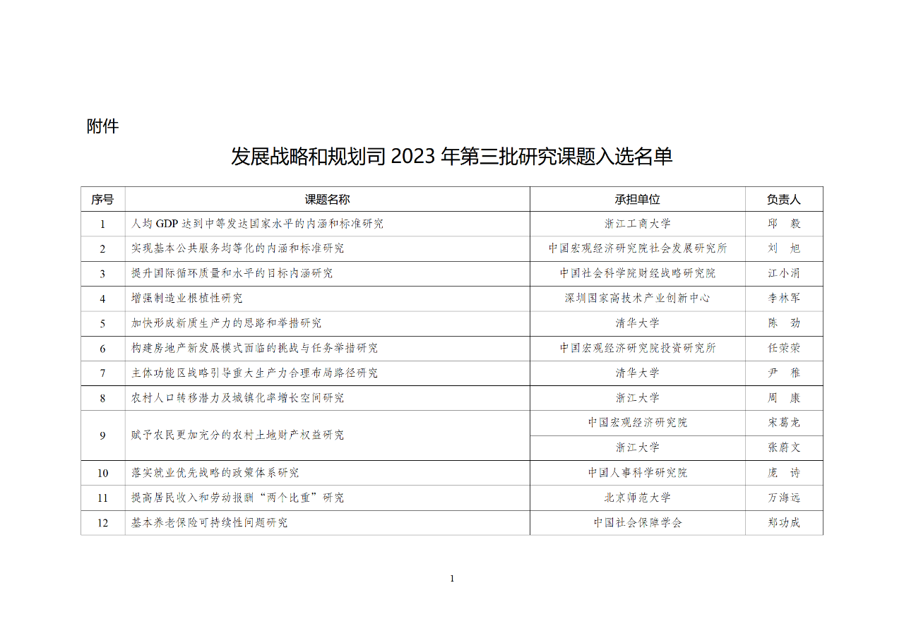 2023年10月20日,我司在國家發(fā)展改革委網(wǎng)站上公開發(fā)布《國家發(fā)展改革委發(fā)展戰(zhàn)略和規(guī)劃司2023年第三批研究課題征集公告》,得到了眾多研究機(jī)構(gòu)及科研院所的積極響應(yīng)和大力支持。經(jīng)嚴(yán)格評(píng)審,現(xiàn)確定了相關(guān)課題的承擔(dān)單位及負(fù)責(zé)人(詳見附件)。近日,我司將與各承擔(dān)單位聯(lián)系,辦理相關(guān)手續(xù)。