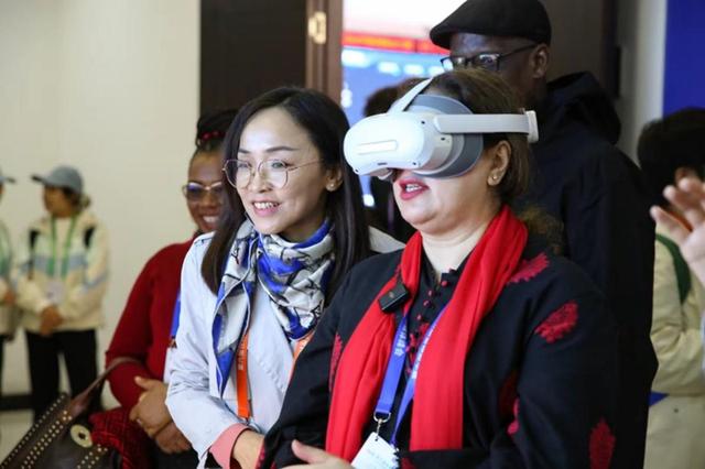 媒體代表使用VR設備感受光伏項目現(xiàn)場。