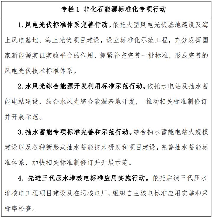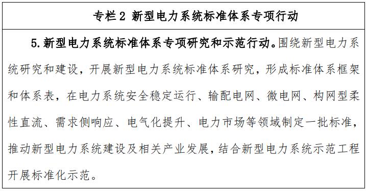 ——建立完善以光伏、風電為主的可再生能源標準體系,研究建立支撐新型電力系統(tǒng)建設的標準體系,加快完善新型儲能標準體系,有力支撐大型風電光伏基地、分布式能源等開發(fā)建設、并網(wǎng)運行和消納利用。