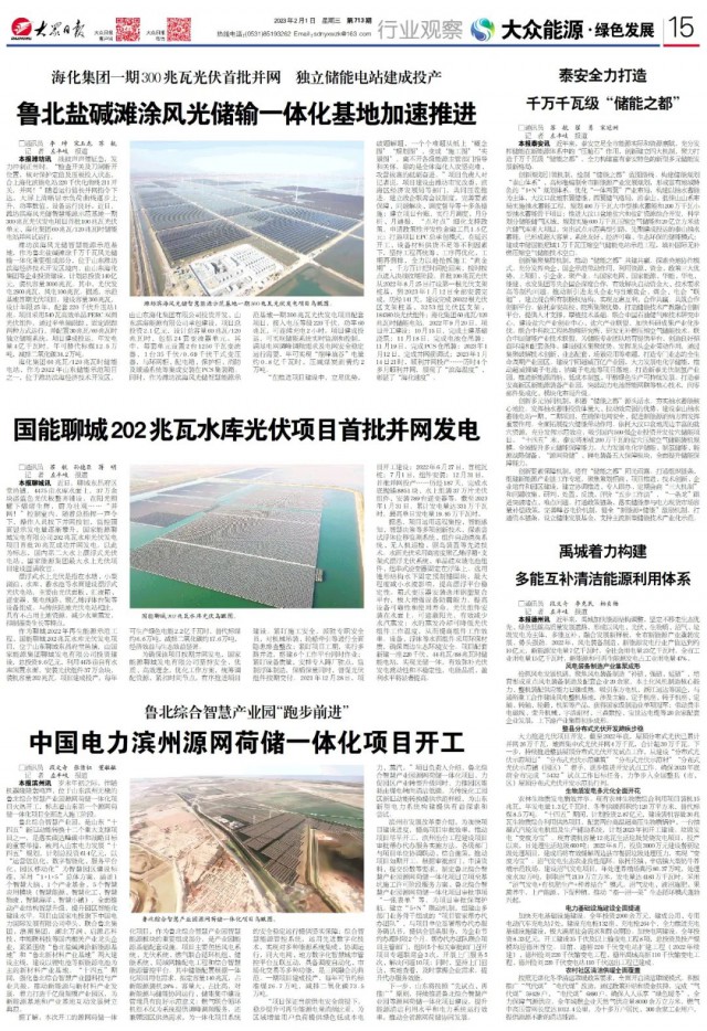 濰坊濱海風(fēng)光儲(chǔ)智慧能源示范基地,作為魯北鹽堿灘涂千萬(wàn)千瓦風(fēng)光儲(chǔ)輸一體化重要組成部分,位于山東濰坊濱海經(jīng)濟(jì)技術(shù)開發(fā)區(qū)境內(nèi),由山東海化集團(tuán)等企業(yè)投資建設(shè),計(jì)劃總投資140億元,裝機(jī)容量3000兆瓦。其中,光伏發(fā)電2900兆瓦,風(fēng)電100兆瓦。據(jù)悉,示范基地首期光伏項(xiàng)目,建設(shè)容量300兆瓦,設(shè)計(jì)年限25年,配套220千伏升壓站1座。項(xiàng)目采用540瓦高效單晶PERC雙面光伏組件,通過平單軸跟蹤、固定跟蹤兩種方式運(yùn)行,并配置30兆瓦/60兆瓦時(shí)獨(dú)立儲(chǔ)能系統(tǒng)。項(xiàng)目建成投運(yùn),年發(fā)電量4億千瓦時(shí),年可替代標(biāo)煤12.5萬(wàn)噸,減排二氧化碳34.2萬(wàn)噸。
