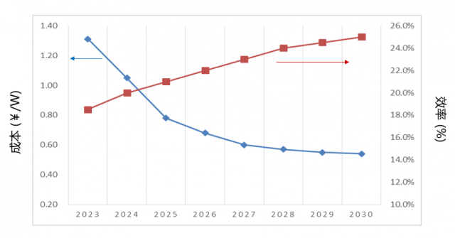 根據(jù)數(shù)據(jù)測算,到2023年平米級鈣鈦礦光伏產(chǎn)品將實現(xiàn)17-19%的效率,后續(xù)持續(xù)提升至25%。百兆瓦級產(chǎn)線階段成本也將控制在1.0-1.5¥/W之間;1GW級時能降到~0.8¥/W;10GW級降到~0.6¥/W??紤]到鈣鈦礦組件成本較低,如果其效率達(dá)到17%,價格達(dá)到1.3¥/W,壽命25年時,就擁有市場競爭力。