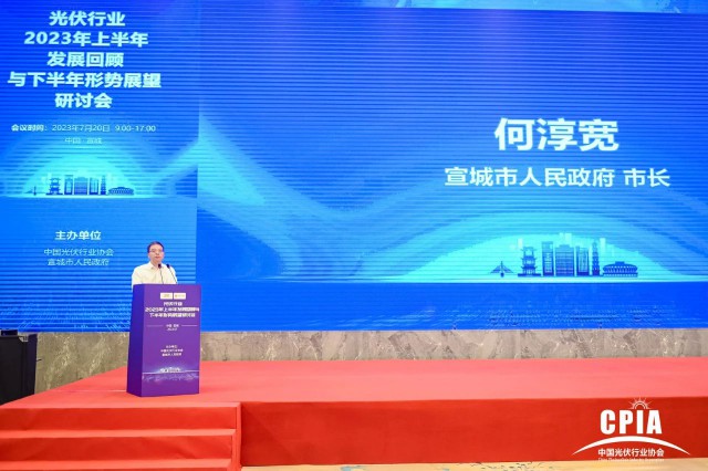 2023年7月20日,由中國(guó)光伏行業(yè)協(xié)會(huì)、宣城市人民政府主辦的“光伏行業(yè)2023年上半年發(fā)展回顧與下半年形勢(shì)展望研討會(huì)”在安徽省宣城市成功舉辦。宣城市人民政府何淳寬市長(zhǎng)出席會(huì)議并致辭。