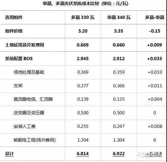 上表我們假設(shè)電站系統(tǒng)選用多晶330瓦或單晶340瓦組件所對應(yīng)的系統(tǒng)成本對比,包含組件、逆變器、匯流箱、支架、線纜、土地、人工等成本。