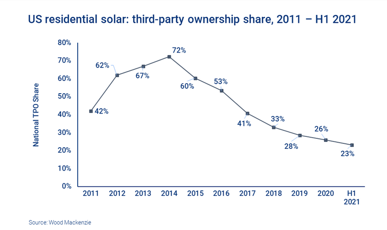 Sunrun公司鞏固了其作為最大TPO供應(yīng)商的地位,在2021年上半年擁有68%的TPO市場份額。在可預(yù)見的未來也將如此,一部分原因是該公司收購了Vivint Solar(前第二大TPO供應(yīng)商),該收購于2020年第四季度完成。