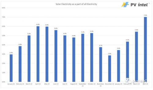 美國(guó)能源部能源信息署(EIA)發(fā)布了最新的月度電力報(bào)告,提供了截至4月底的數(shù)據(jù)。最新數(shù)據(jù)顯示,與去年4月相比,太陽(yáng)能發(fā)電量增長(zhǎng)了16.6%,占當(dāng)月美國(guó)總發(fā)電量的7%多一點(diǎn),高于2022年的6%。