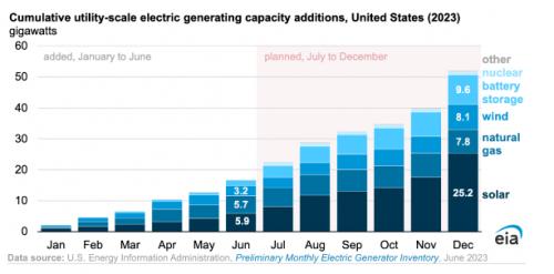 天然氣發(fā)電占2023年上半年美國新增產(chǎn)能的34%(5.7吉瓦),僅次于太陽能。2023年上半年并網(wǎng)的兩個最大項目是天然氣發(fā)電廠:俄亥俄州的1836兆瓦Guernsey發(fā)電站和伊利諾伊州的1214兆瓦CPV Three Rivers能源中心。