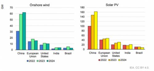 光伏組件價格的下降、分布式光伏系統(tǒng)的更多采用以及大規(guī)模部署的政策推動,推動了包括中國、歐盟、美國和印度在內(nèi)的所有主要光伏市場的增長。相比之下,如果不迅速實(shí)施激勵政策,預(yù)計(jì)2024年全球陸上風(fēng)力發(fā)電新增裝機(jī)容量將比2023年下降約5%。
