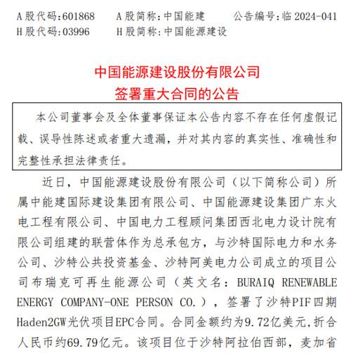 8月13日晚間,中國能建公告稱,公司簽署了沙特PIF四期Haden2GW光伏項目(以下簡稱沙特2GW光伏項目)EPC合同,金額約為9.72億美元(約合人民幣70億元)。