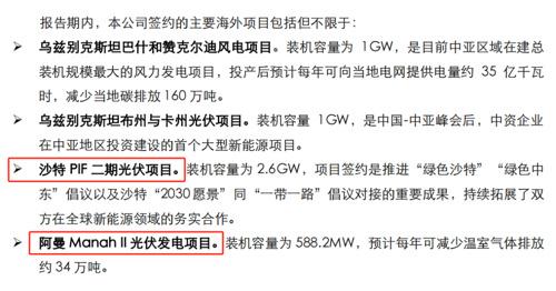 中國能建2023年度社會責任(ESG)報告顯示,報告期內(nèi),公司簽訂的海外項目包含:沙特PIF二期光伏項目、阿曼Manah II光伏發(fā)電項目。