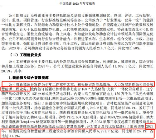 目前,中國能建正在積極搶占新能源市場,大力發(fā)展新能源和綜合智慧能源工程業(yè)務(wù)。2023年,公司新能源及綜合智慧能源工程建設(shè)業(yè)務(wù)新簽合同金額為5291.7億元,同比增長26.1%,占比達41.2%。