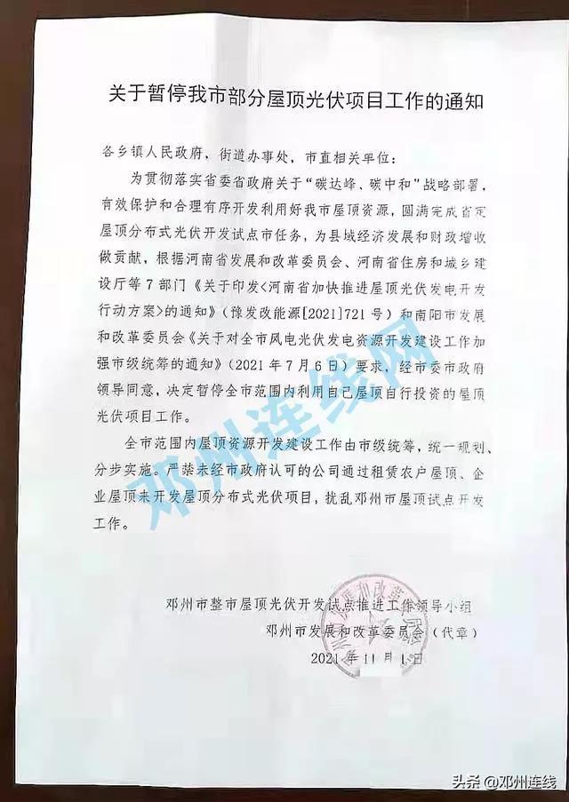 近日,有網(wǎng)友爆料稱,河南省鄧州市以整市屋頂光伏開發(fā)試點推進工作領(lǐng)導小組、市發(fā)改委的名義印發(fā)通知,暫停全市范圍內(nèi)利用自己屋頂自行投資的屋頂光伏項目工作。