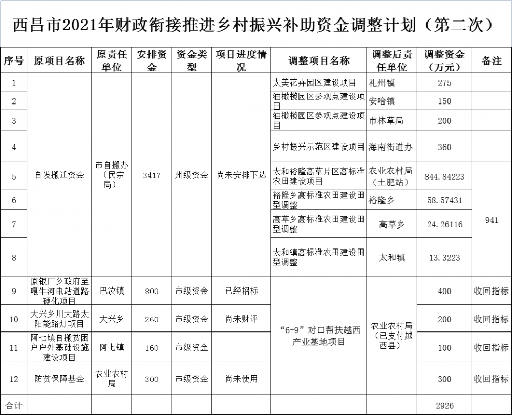 根據(jù)西昌市鄉(xiāng)村振興局《關(guān)于再次調(diào)整使用2021年銜接推進鄉(xiāng)村振興補助資金的請示》(西鄉(xiāng)振發(fā)(2021)18號)文件及領(lǐng)導批示,現(xiàn)將2021年下達市委統(tǒng)戰(zhàn)部(自搬辦):1、自發(fā)搬遷資金1926萬元調(diào)整到禮州鎮(zhèn)太美花卉園區(qū)建設(shè)項目275萬元、 安哈鎮(zhèn)油橄欖園區(qū)參觀點建設(shè)項目150萬元、市林草局油橄欖園區(qū)參觀點建設(shè)項目200萬元、海南街道辦事處鄉(xiāng)村振興示范區(qū)建設(shè)項目360萬元、太和裕隆高草片區(qū)高標準農(nóng)田建設(shè)項目941萬元;2、收回以下單位指標:⑴、巴汝鎮(zhèn)原銀廠鄉(xiāng)政府至嘎牛河電站道路硬化項目資金400萬元;⑵、大興鄉(xiāng)川大路太陽能路燈項目資金200萬元;⑶、阿七鎮(zhèn)自搬貧困戶戶外基礎(chǔ)設(shè)施建設(shè)項目資金100萬元;⑷、農(nóng)業(yè)農(nóng)村局防貧保障基金300萬元;3、將西昌市援建越西縣 “6+9”對口幫扶越西產(chǎn)業(yè)基地項目1000萬元調(diào)入鄉(xiāng)村振興項目,給予在網(wǎng)上公示。