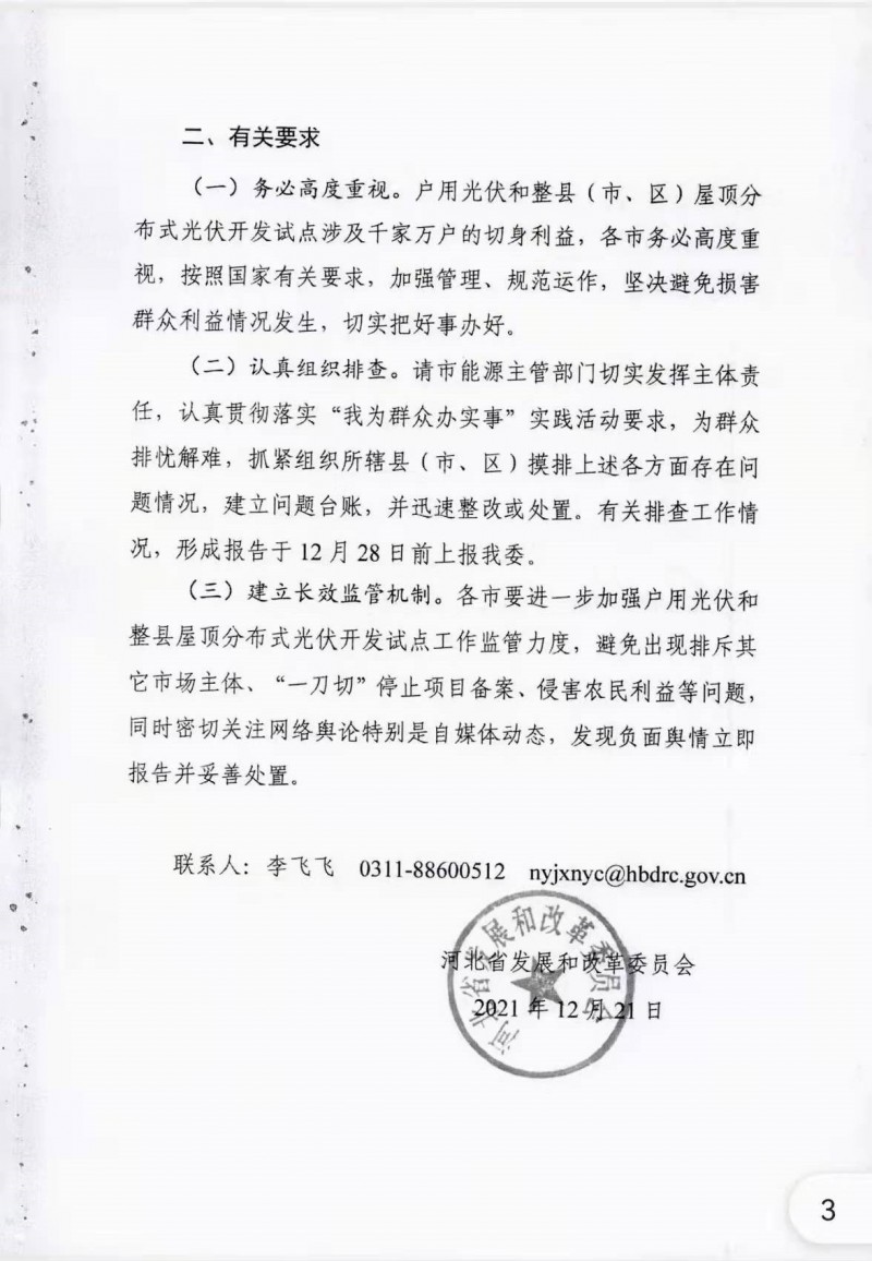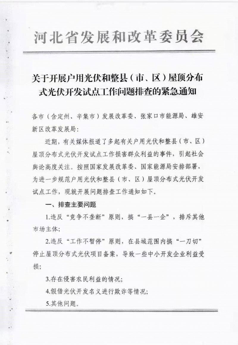 12月21日,河北省發(fā)改委下發(fā)《關(guān)于開展戶用光伏和整縣(市、區(qū))屋頂分布式光伏開發(fā)試點工作問題排查的緊急通知》,文件指出:近期有關(guān)媒體報道多起有關(guān)戶用光伏和整縣(市、區(qū))屋頂分布式光伏開發(fā)試點工作損害群眾利益的事件,引發(fā)社會輿論高度關(guān)注。按照國家發(fā)展改革委、國家能源局安排部署,為進(jìn)一步規(guī)范戶用光伏和整縣(市、區(qū))屋頂分布式光伏開發(fā)試點工作,開展問題排查工作。有關(guān)排查工作情況,于12月28日上報。