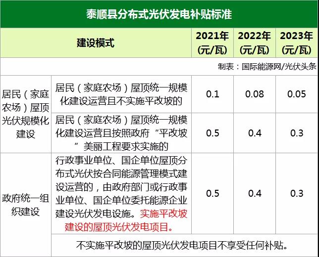 居民(家庭農(nóng)場)屋頂統(tǒng)一規(guī)?;ㄔO(shè)運(yùn)營且按照政府“平改坡”美麗工程要求實(shí)施的,在光伏發(fā)電項(xiàng)目建成、并網(wǎng)和驗(yàn)收后給予居民發(fā)放一次性平改坡建設(shè)補(bǔ)貼。2021年、2022年、2023年建成、并網(wǎng)和驗(yàn)收的實(shí)行差異化補(bǔ)貼,補(bǔ)貼標(biāo)準(zhǔn)分別為0.5元/瓦、0.4元/瓦、0.3元/瓦。
