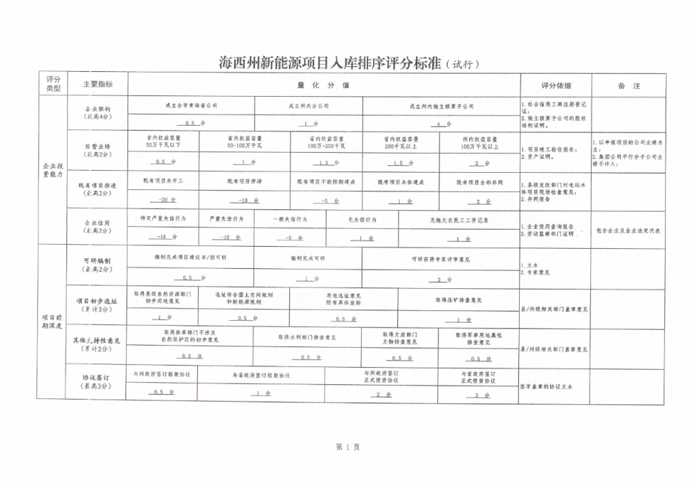 1月19日,青海海西州發(fā)改委印發(fā)《新能源項目入庫排序評分標(biāo)準(zhǔn)》,通過八大類35小項的評分類型對新能源項目進(jìn)行評分排序。