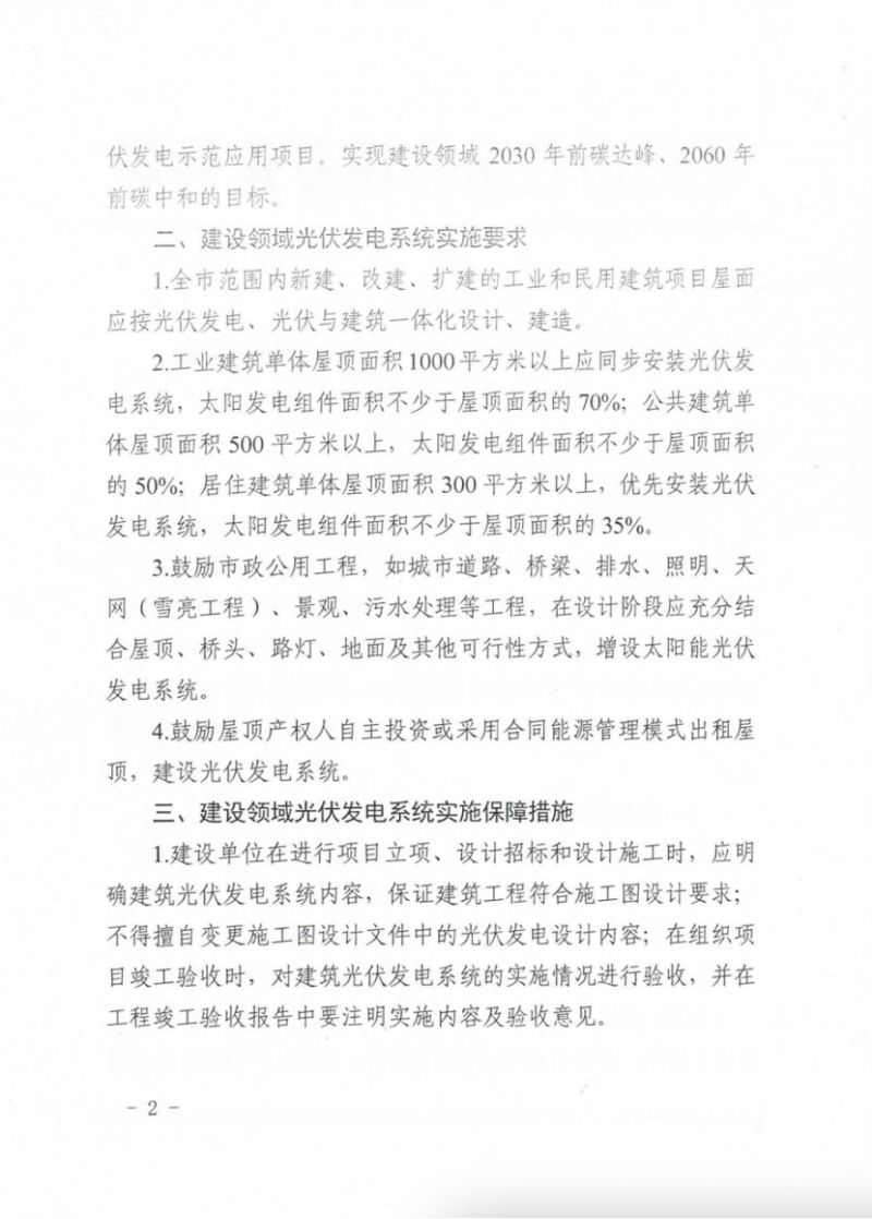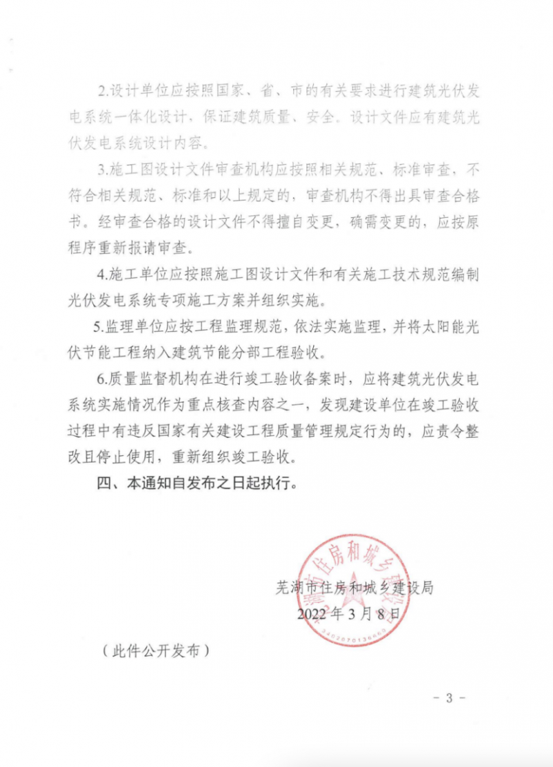 3月10日,安徽蕪湖市住建局發(fā)布關(guān)于加快建設(shè)領(lǐng)域光伏發(fā)電推廣應(yīng)用的通知,通知指出,全市范圍內(nèi)新建、改建、擴(kuò)建的工業(yè)和民用建筑項(xiàng)目屋面應(yīng)按光伏發(fā)電、光伏與建筑一體化設(shè)計(jì)、建造。其中,工業(yè)建筑單體屋頂面積1000平方米以上應(yīng)同步安裝光伏發(fā)電系統(tǒng),太陽(yáng)發(fā)電組件面積不少于屋頂面積的70%。