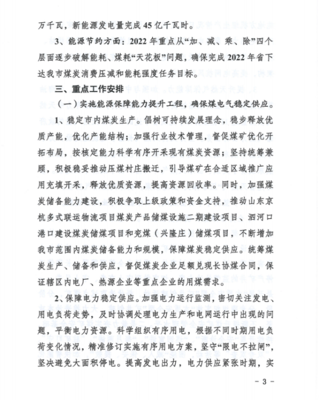 2、能源生產(chǎn)方面:(1)按照現(xiàn)行政策不變的情況下,2022年內(nèi)全市煤炭產(chǎn)量穩(wěn)定在5200萬噸左右;各類發(fā)電企業(yè)完成發(fā)電量490億千瓦時(shí)左右;(2)貫徹落實(shí)國家及省市煤電裝機(jī)相關(guān)政策,穩(wěn)步實(shí)施“上大壓小”,2022年煤電裝機(jī)容量穩(wěn)定在1050萬千瓦左右;(3)立足濟(jì)寧市資源稟賦實(shí)際,加快新能源開發(fā)利用和消納能力提升,力爭2022年底新能源總裝機(jī)實(shí)現(xiàn)350萬千瓦,新能源發(fā)電量完成45億千瓦時(shí)。