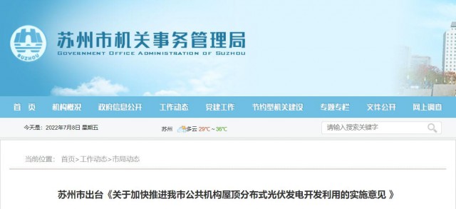 意見明確,到2025年底,蘇州市公共機(jī)構(gòu)新建建筑可安裝光伏屋頂面積實(shí)現(xiàn)光伏覆蓋率達(dá)到50%以上,全市公共機(jī)構(gòu)既有建筑屋頂建設(shè)光伏設(shè)施,安裝比例不低于可安裝光伏屋頂面積的50%。常熟市、吳江區(qū)、吳中區(qū)、相城區(qū)等四個(gè)全國整縣(市、區(qū))屋頂分布式光伏開發(fā)試點(diǎn)地區(qū)公共機(jī)構(gòu)于2023年底前達(dá)成上述目標(biāo)