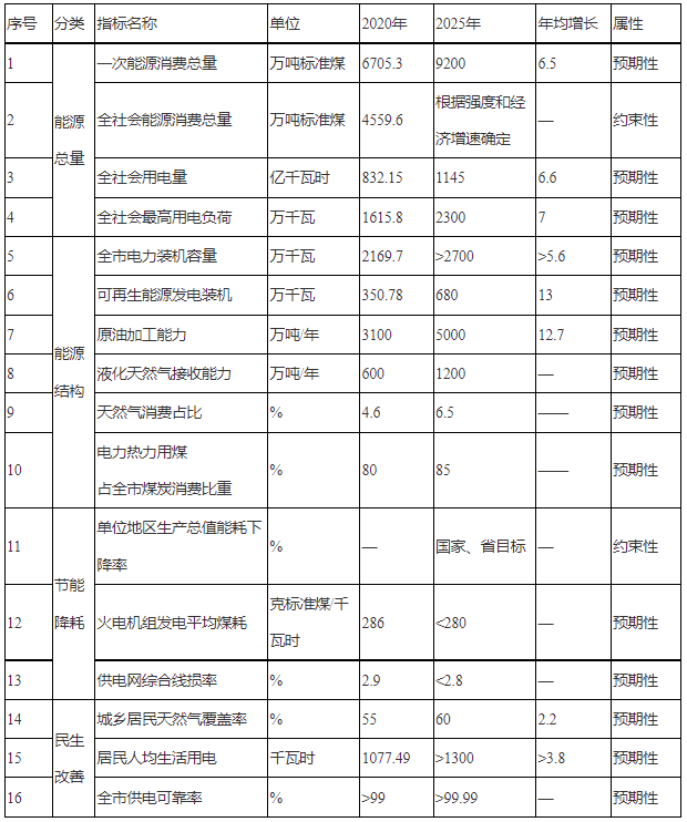 2.結(jié)構(gòu)目標(biāo)。到2025年,全市電力裝機容量達(dá)到2700萬千瓦以上,其中,可再生能源發(fā)電裝機容量達(dá)到680萬千瓦以上,清潔能源發(fā)電裝機占電力總裝機容量達(dá)到45%以上;原油加工能力達(dá)到5000萬噸/年,液化天然氣接收能力達(dá)到1200萬噸/年;全市能源消費結(jié)構(gòu)進(jìn)一步優(yōu)化,天然氣消費占比力爭達(dá)到6.5%;電力熱力用煤占全市煤炭消費比重達(dá)到85%以上。