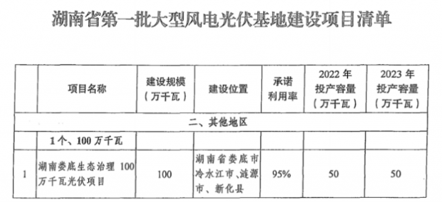 第一批風(fēng)光大基地名單中的另一項(xiàng)目,湖南婁底生態(tài)治理100萬千瓦光伏項(xiàng)目,首批500MW將于2022年10月30日前并網(wǎng)。