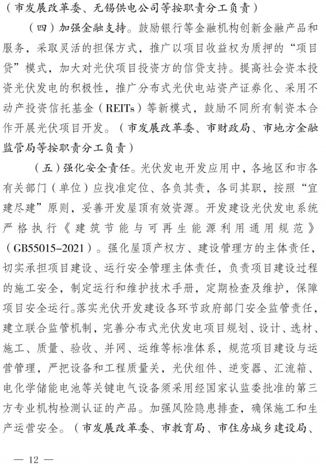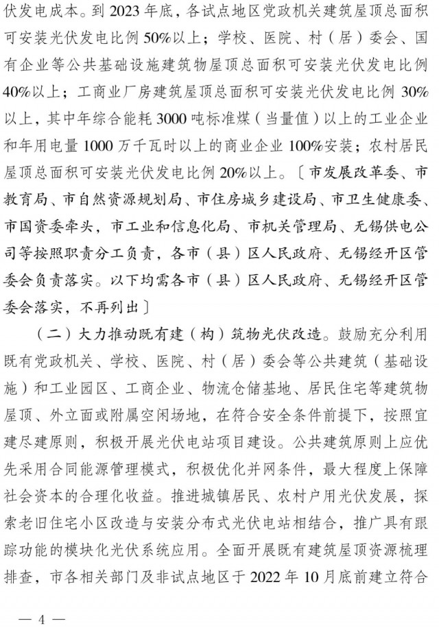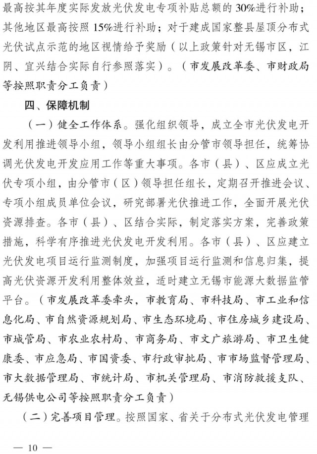 此外,“十四五”期間,對(duì)于完成新增并網(wǎng)目標(biāo),安排光伏發(fā)電補(bǔ)貼資金并落實(shí)補(bǔ)貼的地區(qū),市級(jí)自 2022年起分年度給予補(bǔ)助。對(duì)納入全國(guó)整縣(市、區(qū))屋頂分布式光伏開發(fā)試點(diǎn)的地區(qū),最高按其年度實(shí)際發(fā)放光伏發(fā)電專項(xiàng)補(bǔ)貼總額的30%進(jìn)行補(bǔ)助;其他地區(qū)最高按照15%進(jìn)行補(bǔ)助;對(duì)于建成國(guó)家整縣屋頂分布式光伏試點(diǎn)示范的地區(qū)視情給予獎(jiǎng)勵(lì)(以上政策針對(duì)無錫市區(qū),江陰、宜興結(jié)合實(shí)際自行參照落實(shí))。