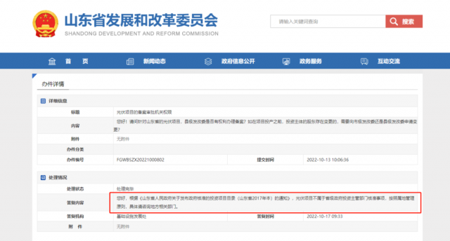 10月17日,山東發(fā)改委針對光伏項(xiàng)目的備案審批機(jī)關(guān)權(quán)限做出回復(fù),詳情如下:
