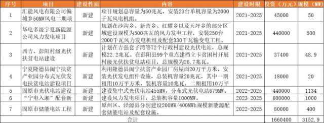 近期,固原市人民政府辦公室印發(fā)固原市自然資源保護和利用“十四五”規(guī)劃的通知。根據(jù)光伏們查詢,在固原市自然資源保護和利用“十四五”規(guī)劃建設項目庫中,有關清潔能源產(chǎn)業(yè)的項目共10個。其中包括光伏、風電、儲能的項目共7個,合計新能源新建規(guī)模3152.9MW,總投資金額166億元。具體項目名單如下: