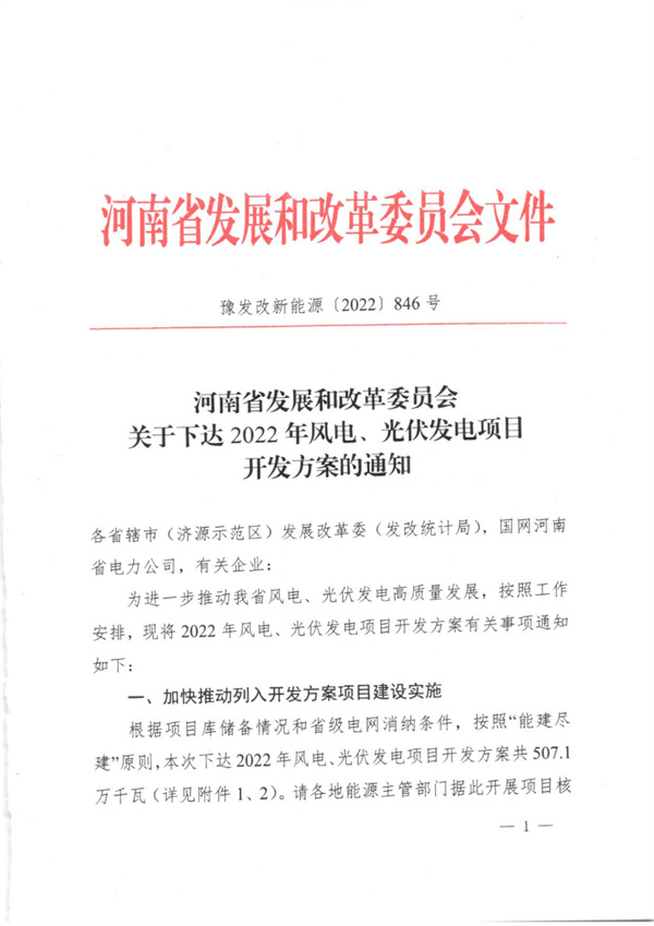 10月20日,河南省發(fā)改委發(fā)布了《關(guān)于下達(dá)2022年風(fēng)電、光伏發(fā)電項(xiàng)目開(kāi)發(fā)方案》的通知。文件顯示,河南省本次下達(dá)2022年風(fēng)電、光伏發(fā)電項(xiàng)目開(kāi)發(fā)方案共507.1萬(wàn)千瓦。其中集中式光伏35萬(wàn)千瓦,分布式光伏16.102萬(wàn)千瓦;風(fēng)電456萬(wàn)千瓦。其中儲(chǔ)能配置要求按照20%~55%、時(shí)長(zhǎng)2~4小時(shí)不等。