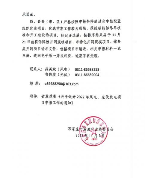 11月7日,河北省石家莊市發(fā)改委印發(fā)《關(guān)于做好2022年風(fēng)電、光伏發(fā)電項(xiàng)目申報(bào)工作的通知》,要求項(xiàng)目需按期開(kāi)工、并網(wǎng),并由縣級(jí)政府和開(kāi)發(fā)企業(yè)出具承諾函;縣級(jí)政府不得強(qiáng)制增加其它附加條件,并出具承諾函。