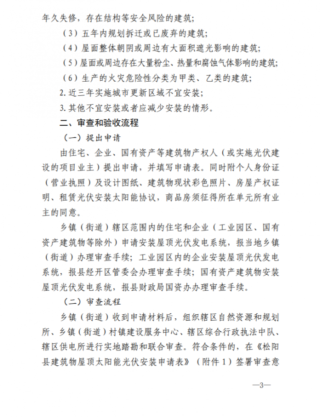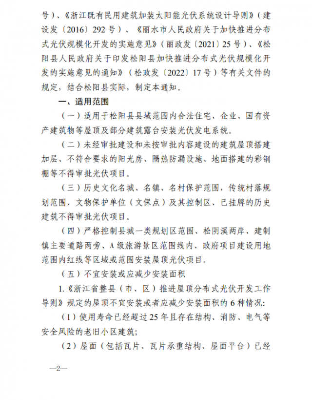 1、適用范圍:適用于松陽(yáng)縣縣域范圍內(nèi)合法住宅、企業(yè)、國(guó)有資產(chǎn)建筑物等屋頂及部分建筑露臺(tái)安裝光伏發(fā)電系統(tǒng),并說(shuō)明補(bǔ)充5類(lèi)不得安裝或不宜安裝及減少安裝的情形。