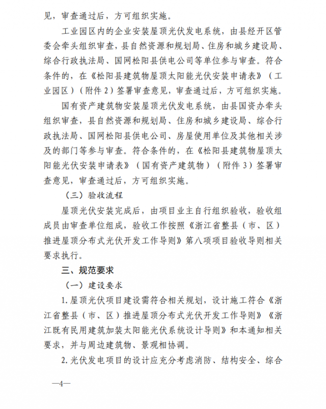 2、審查和驗(yàn)收流程:建筑產(chǎn)權(quán)人或光伏項(xiàng)目業(yè)主提出申請(qǐng),填寫(xiě)《松陽(yáng)縣建筑物屋頂太陽(yáng)能光伏安裝申請(qǐng)表》并附相關(guān)申請(qǐng)資料,按照所屬區(qū)塊報(bào)屬地鄉(xiāng)鎮(zhèn)街道或縣經(jīng)開(kāi)區(qū)管委會(huì)牽頭組織審查,國(guó)有資產(chǎn)屋頂建設(shè)光伏項(xiàng)目報(bào)縣財(cái)政局國(guó)資辦組織審查。自然資源和規(guī)劃局、住房和城鄉(xiāng)建設(shè)局、綜合新增執(zhí)法局、國(guó)網(wǎng)松陽(yáng)縣供電公司等相關(guān)部門(mén)或其下屬派出機(jī)構(gòu)參與審查。符合條件的,各審查單位在申請(qǐng)表中簽署審查意見(jiàn),方可組織實(shí)施。建設(shè)完成后,項(xiàng)目業(yè)主自主驗(yàn)收,審查單位參與驗(yàn)收,驗(yàn)收工作按照《浙江省整縣(市、區(qū))推進(jìn)屋頂分布式光伏開(kāi)發(fā)工作導(dǎo)則》第八項(xiàng)項(xiàng)目驗(yàn)收導(dǎo)則相關(guān)要求執(zhí)行。