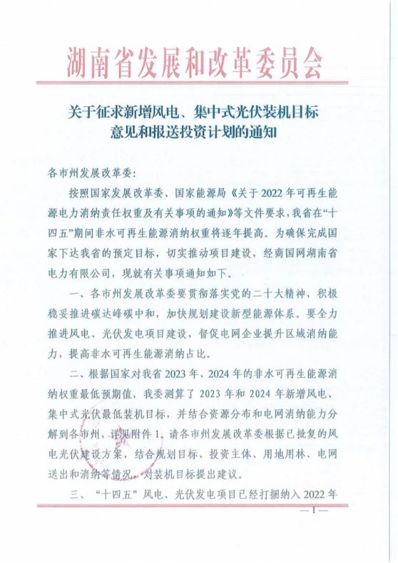 11月10日,湖南省發(fā)改委下發(fā)《關(guān)于征求新增風電、集中式光伏裝機目標意見和報送投資計劃的通知》?!锻ㄖ分赋?,根據(jù)國家對湖南省2023年、2024年的非水可再生能源消納權(quán)重最低預(yù)期值,湖南發(fā)改委測算了2023年和2024年新增風電、集中式光伏最低裝機目標,并結(jié)合資源分布和電網(wǎng)消納能力分解到各市州。其中,2023年湖南新增風電規(guī)模為225萬千瓦,新增光伏裝機規(guī)模為340萬千瓦;2024年湖南新增風電規(guī)模為330萬千瓦,新增光伏裝機規(guī)模為300萬千瓦。