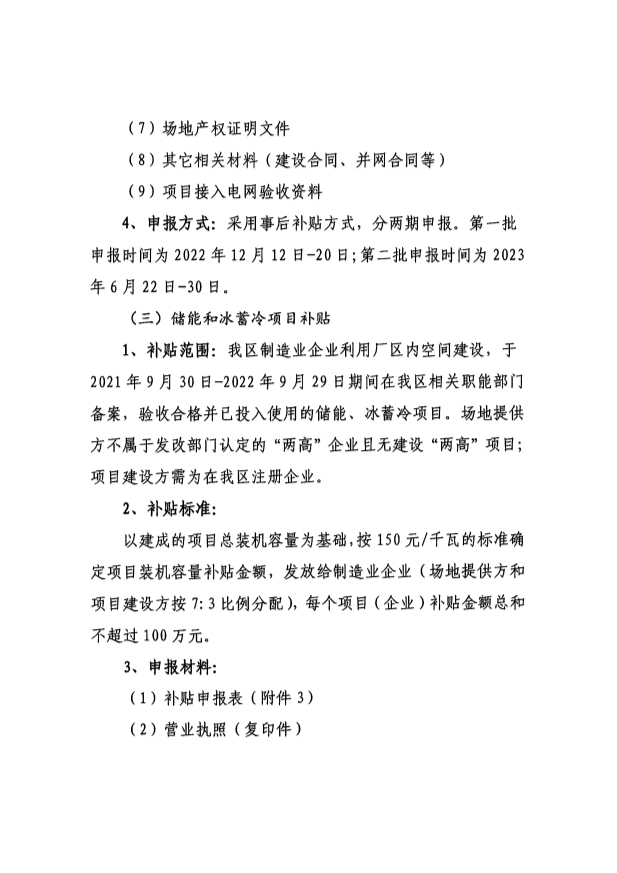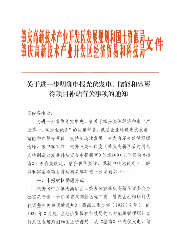為進(jìn)一步貫徹落實(shí)中央、省關(guān)于振興實(shí)體經(jīng)濟(jì)和市“產(chǎn)業(yè)第一、制造業(yè)優(yōu)先”的決策部署,鼓勵(lì)企業(yè)建設(shè)光伏發(fā)電、儲(chǔ)能和冰蓄冷項(xiàng)目,支持制造業(yè)發(fā)展,有力有序有效做好碳達(dá)峰、碳中和工作,根據(jù)《關(guān)于印發(fā)〈肇慶高新區(qū)節(jié)約用電支持制造業(yè)發(fā)展補(bǔ)貼資金申報(bào)指南〉的通知》(以下簡(jiǎn)稱(chēng)《指南》)等有關(guān)規(guī)定,結(jié)合我區(qū)實(shí)際,現(xiàn)就申報(bào)光伏發(fā)電、儲(chǔ)能和冰蓄冷項(xiàng)目補(bǔ)貼有關(guān)事項(xiàng)進(jìn)一步明確如下: