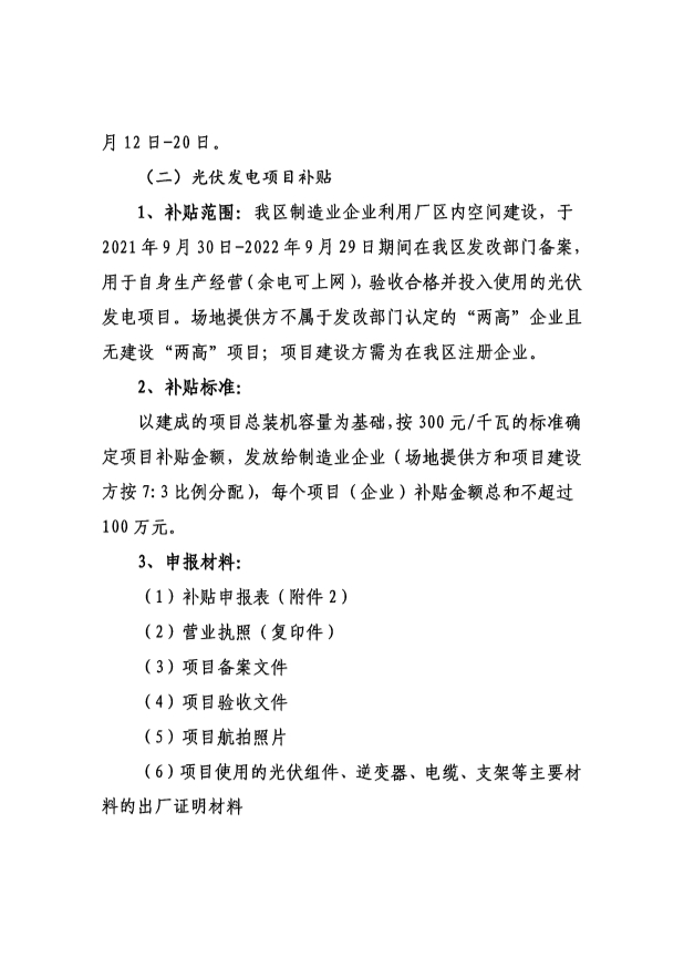 12月10日,廣東省肇慶高新區(qū)發(fā)展規(guī)劃和國(guó)土資源局、肇慶高新區(qū)經(jīng)濟(jì)貿(mào)易和科技局發(fā)布《關(guān)于進(jìn)一步明確申報(bào)光伏發(fā)電、儲(chǔ)能和冰蓄冷項(xiàng)目補(bǔ)貼有關(guān)事項(xiàng)的通知》,《通知》中提到:我區(qū)制造業(yè)企業(yè)利用廠區(qū)內(nèi)空間建設(shè),于2021年9月30日-2022年9月29日期間在我區(qū)發(fā)改部門(mén)備案,用于自身生產(chǎn)經(jīng)營(yíng)(余電可上網(wǎng)),驗(yàn)收合格并投入使用的光伏發(fā)電項(xiàng)目。